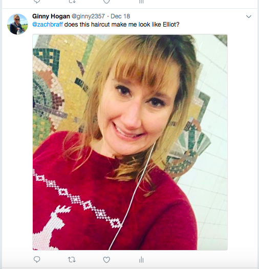 I had Elliot’s haircut, and I had her moxie. I was all ready to take over Elliot’s identity, so I decided I should go after her leading man. I just figured I’d tweet at Zach Braff a few times to let him know I was Elliot now, and then we’d be in business.