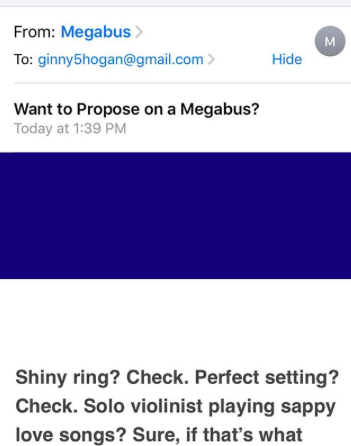 It’s so nice to really be here in the moment with you. The moment I proposed to you: my future wife. It’s especially easy to stay in the moment because the wifi is extremely sporadic. In fact, everyone else on this bus is here in the moment with us. Hi, friends. I’m sorry all of your cars broke down/were too expensive. I’m glad we got to entertain you, fellow passengers. And Nate, I’m sorry I knocked my head into your crotch and spilled your diet coke when I got down on one knee. But I’m sure you understand — I had to do this the classy way.