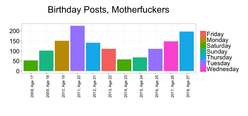 It was weird to break out ggplot again to write this. Let me tell you — I may be working off a smaller laptop now (owing to no longer having a tech job), but nothing makes you feel old like having to rotate your x-axis labels 90 degrees to fit in all the years you’ve been logging happy birthday posts. And I’m sure that’s an extremely relatable feeling that you can all agree with.