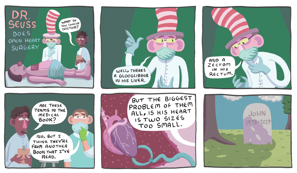 October 23, 2019October 21, 2019 Little Old Lady Contributor Dr. Seuss Does Open Heart Surgery by Erik Jasek Share this: Share on X (Opens in new window) X Share on Facebook (Opens in new window) Facebook Like Loading... Related