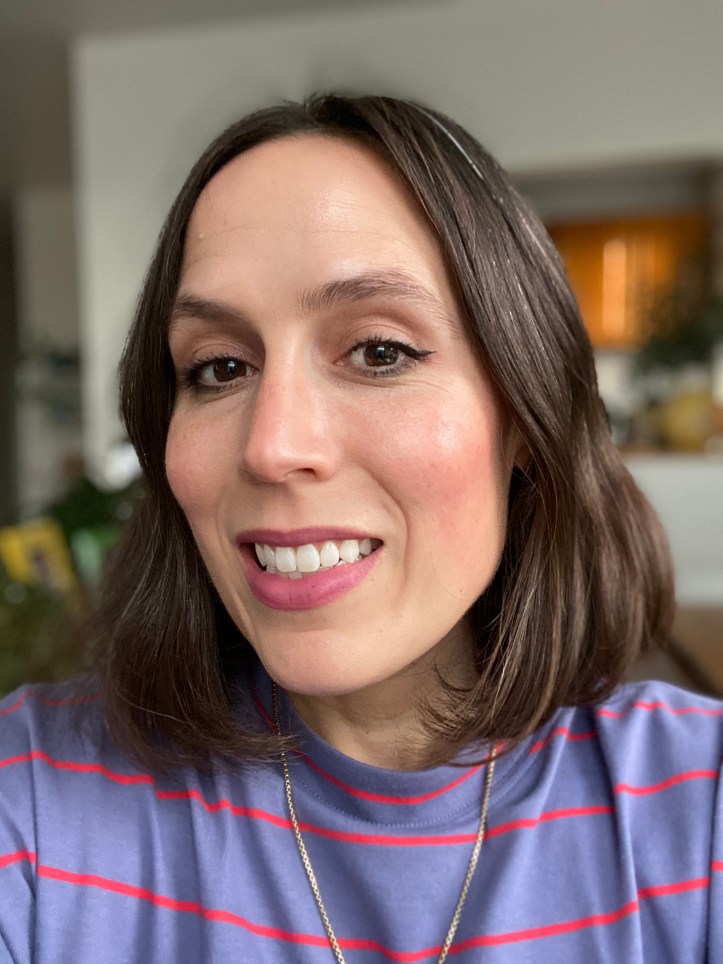 Sometimes I draw a dramatic, thick line that curves out far, but more often I just do a skinny flick of a cat eye, a little something to make my eyes look wider. I only use my liquid liner about once a week because I don’t have a lot of fancy engagements, but there’s something to be said about creating your own occasion, and good makeup certainly is an Occasion. Good makeup can turn a regular Tuesday night into a Tuesday night where you have two spiked seltzers and cry to your boyfriend about how much you love someone else’s dog.