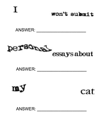 In the meantime, please confirm that you’re a human and not a humorless robot by deciphering the puzzles below. Please answer in the spaces provided.