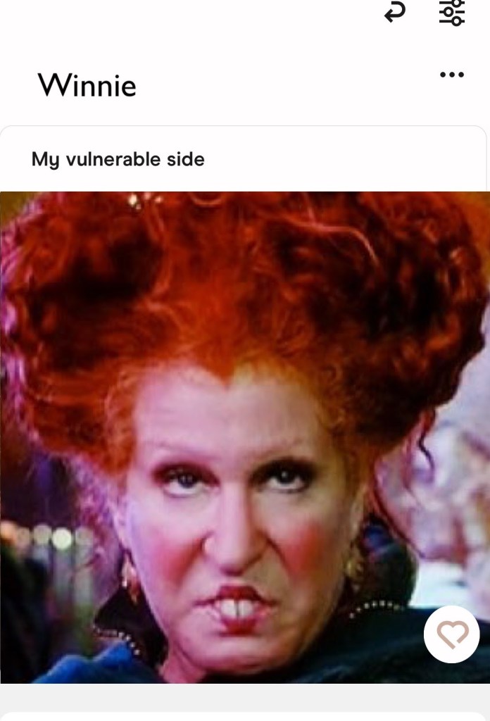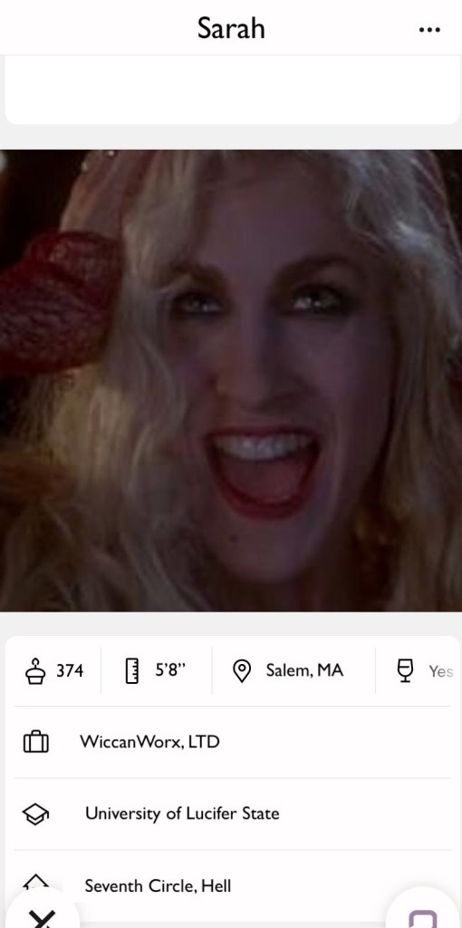 An overshare… I once laid with my dear sister Winifred’s ex-lover, Billy Butcherson, because he confessed his love for me and I enjoyed seeing him cry. When she found out, sweet Winnie poisoned him and sewed his mouth shut and now he rests in limbo for all eternity. Hot girl autumn xx