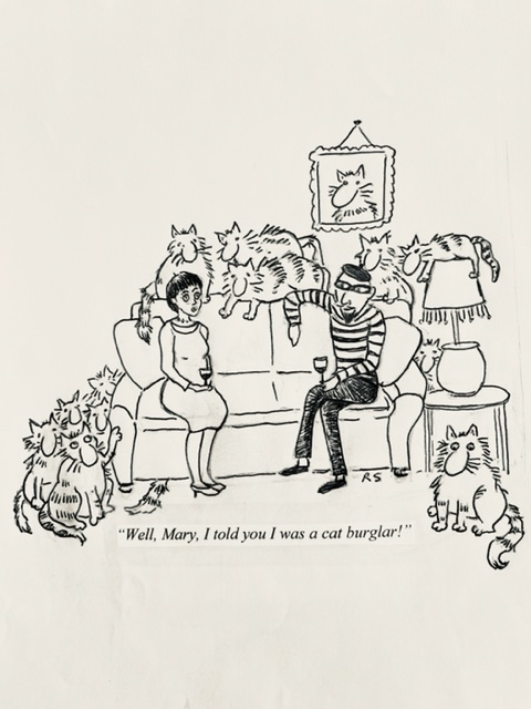 So do the cats belong to the lady and she’s being robbed, or are the cats the burglar’s and they’re on a date, OR DO THE CATS OWN THE HUMANS and have lulled us into a state where we think we’re in charge by feeding them, cleaning up after them, and acting as pre-warmed furniture?
