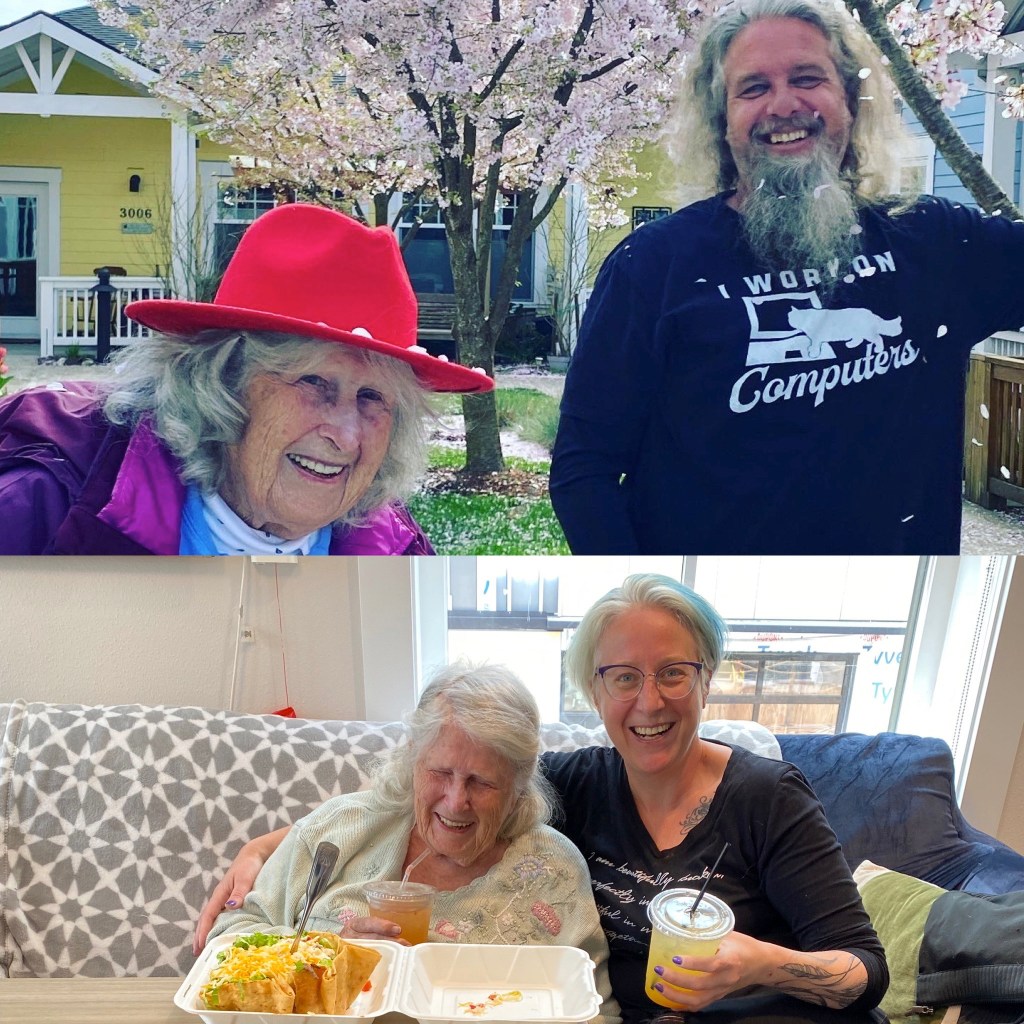 Blossoms began cascading over Noni. Blindly, unaware that Jesse was shaking the budding tree covering her with soft pink and white petals, Noni gently caught a few in her hand as we inched our way to a nearby bench. This was the first visit that we had with Noni since Covid started and the changes are significant. She has moved into 24-hour memory care. The days of soon to be 94-year-old Noni racing around campus from one activity to another, guided by the small amount she could see out of the periphery of her right eye, are over.